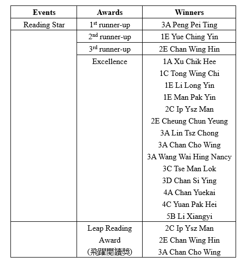 Our school actively promotes electronic reading and recently achieved the 1st runner-up position in the ′E-reading Scheme for Secondary Schools′ organized by JoyReadClub. This is a commendable accomplishment.