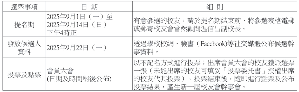 以下是選舉幹事的規則及新一屆校友會幹事會的選舉日程: